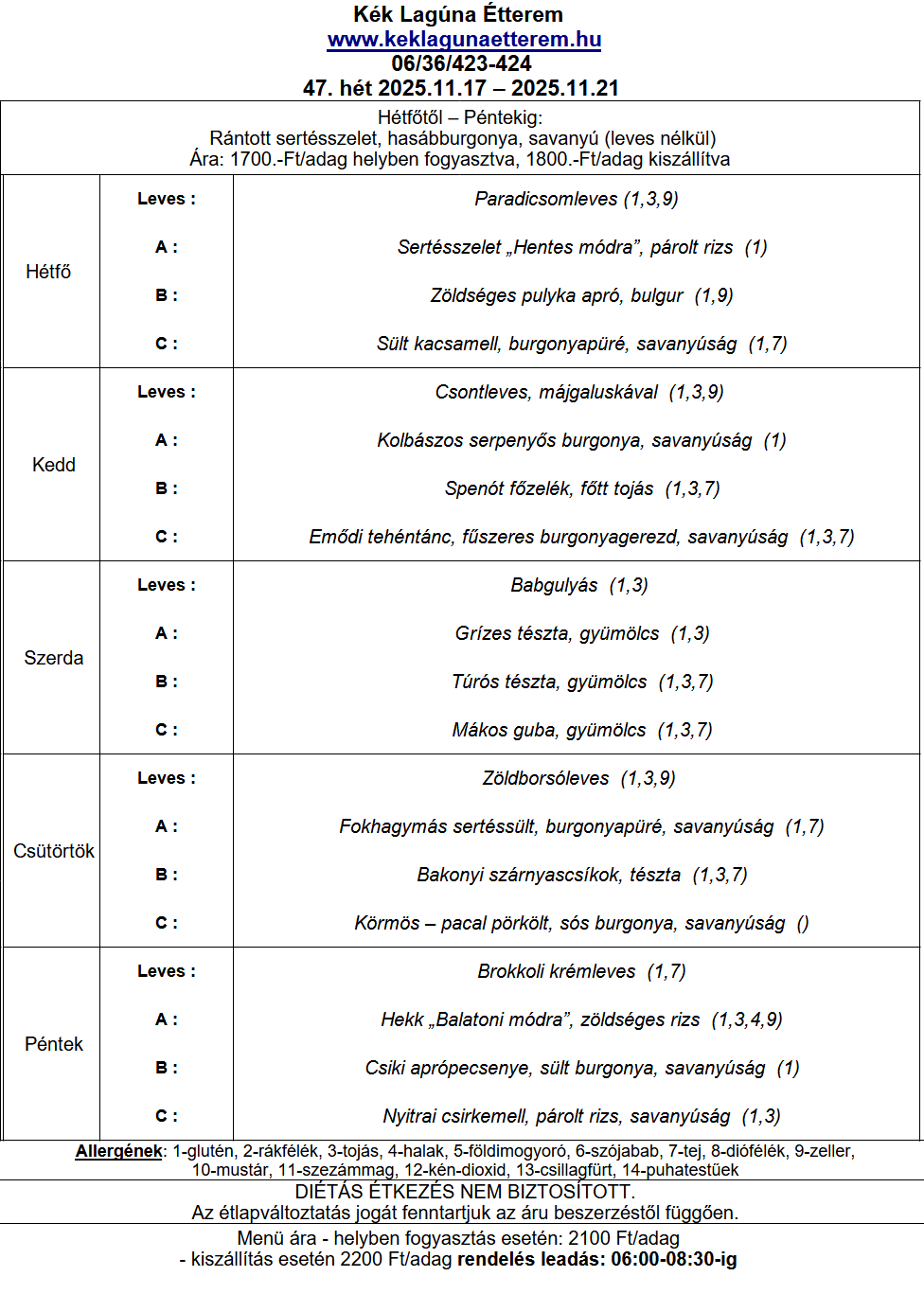 A menü ára 2.100 Ft/adag helyben fogyasztva, 2.200 Ft/adag kiszállítva.